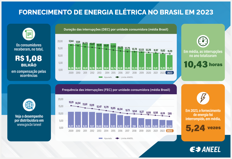 Os consumidores ficaram 10,43 horas em média sem energia (DEC) no ano, o que representa uma redução de 6,9% em relação a 2022, quando registrou-se 11,20 horas em média. A frequência (FEC) das interrupções se manteve em trajetória decrescente, reduzindo de 5,47 interrupções em 2022 para 5,24 interrupções em média por consumidor em 2023, o que significa uma melhora de 4,2% no período.