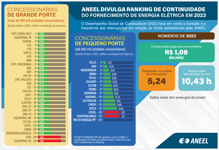 A classificação é elaborada com base no Desempenho Global de Continuidade (DGC), formado a partir da comparação dos valores apurados de DEC e FEC das concessionárias em relação aos limites estabelecidos pela ANEEL para esses indicadores. O ranking é um instrumento que incentiva as concessionárias a buscarem a melhoria contínua da qualidade do serviço, sendo publicado anualmente pela Agência desde 2012. Veja aqui o ranking dos anos anteriores.
