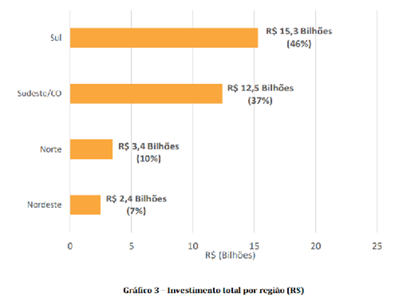 Por região é o Sul o maior destino dos recursos recomendados. São R$ 15,3 bilhões (46% do total), outros R$ 12,5 bilhões no submercado Sudeste/Centro-Oeste (37%), R$ 3,4 bilhões no Norte (10%) e R$ 2,4 bilhões para o Nordeste (7%).